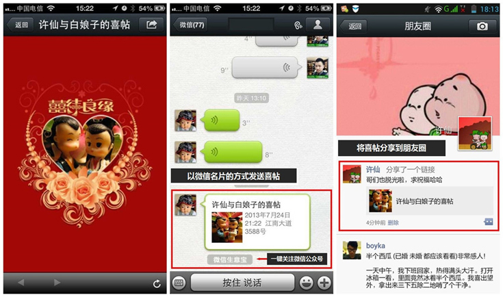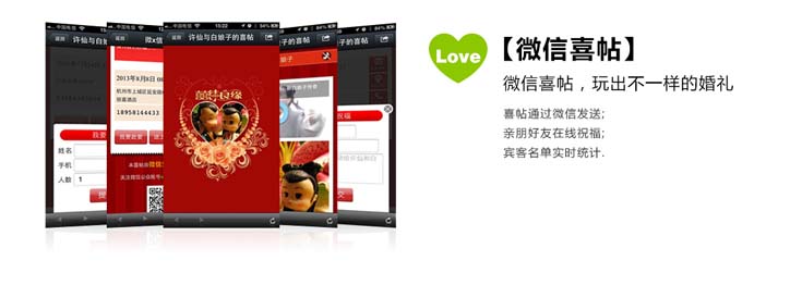摒弃传统的纸质喜帖,转而利用微信报喜,在当下的婚庆行业已经带来了全新的革命风暴。为陈敏聪策划,并提供微信喜帖服务的是在中山地很具影响力的影楼之一“IDEA-LOVE婚礼高端定制”,微信号是IDEA-LOVE,关注之后回复“喜帖”二字就可以看到微信喜帖的表现形式。该影楼负责人麦总说:“像陈小姐这样发送微信喜帖,其实在北京、上海、杭州等大城市中已经成为一种流行。微信喜帖的特点和优势,让现在的都市白领,新新人类们无法抗拒。当初我们采购了微信生意宝的微信喜帖产品,是作为一个特色小服务,没想到已经成为我们店吸引顾客的最大噱头。”