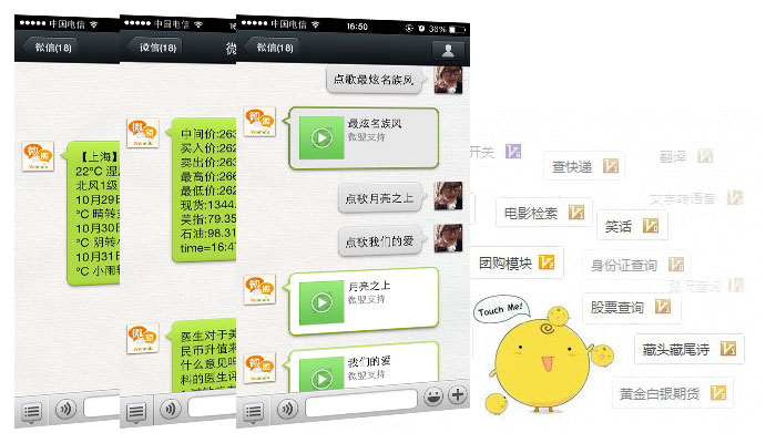 天气查询 ,手机查询,邮编查询,快递查询(支持160家快递公司),身份证查询,人品计算,翻译,字典,百科(全网数据),音乐80.1万 ,笑话5万条,诗词23万首,诗句 225万,成语5万,谜语5万,解梦3万,糗事55万,公交线路4万,火车线路4500,机器人学习功能等等......