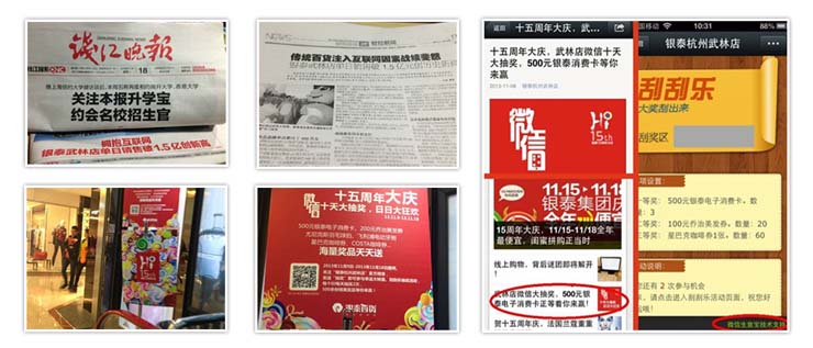 案例一:杭州武林银泰 使用微信生意宝系统连续十天进行抽奖造势,店庆当日邀请马云助阵。今年银泰百货杭州武林店店庆以全面拥抱互联网的姿态创下了单日销售新高:在11月16日单日销售1.506亿元,较历史最高单日销售暨去年的1.112亿元大幅提升35.4%。