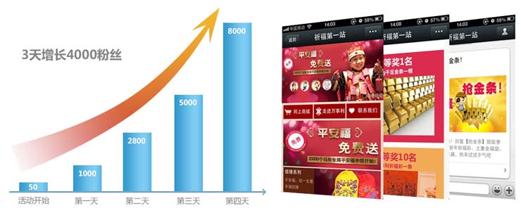 案例三:万事利集团 策划运营万事利集团祈福第一站“砸金蛋、抢金条”,“马上有福袋”活动,3天时间增长4000粉丝,并为万事利集团微信商城吸引了78个实际订单!为万事利微商城的经营提供了一个良好的基础。